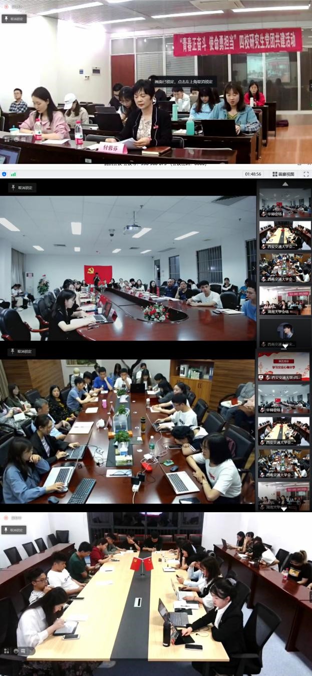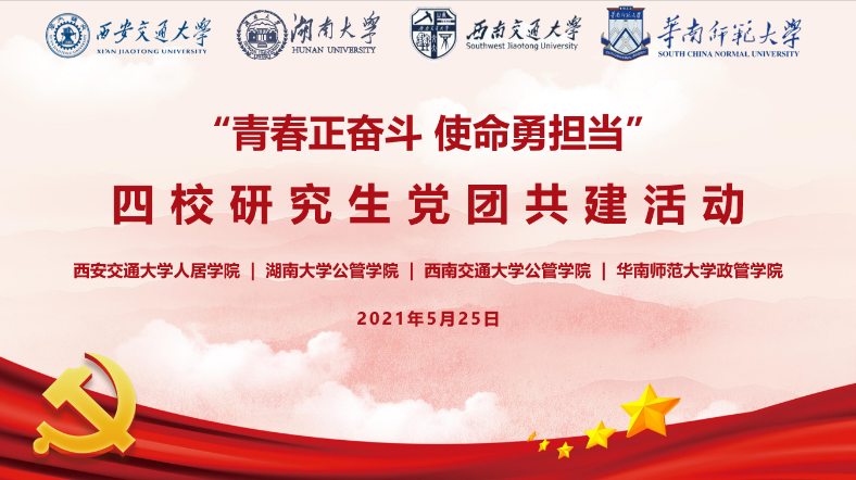述往思来,向史而新。党的历史是最生动、最有说服力的教科书。我们党已经发展成为一个走过百年光辉历程、在最大的社会主义国家执政70多年、拥有9100多万党员的世界上最大的马克思主义执政党。重温党领导人民革命、改革、建设社会主义的历史进程,不难发现,百年历程离不开一代又一代心怀国运的中国青年,他们为国家富强、民族振兴、人民幸福不懈拼搏奋斗。为深化学生党员党史学习教育,用党的奋斗历程和伟大成就鼓舞青年党员斗志、明确方向,用党的光荣传统和优良作风坚定信念、凝聚力量,用党的实践创造和历史经验启迪智慧、砥砺品格。2021年5月25日,yl23455永利官网硕士2020级公共管理第一党支部联合西安交大人居学院2020级专硕党支部、湖南大学yl23455永利官网2020级研究生党支部、华南师范大学政治与yl23455永利官网2020级研究生职教党支部共同组织开展“青春正奋斗 使命勇担当”四校研究生党团共建活动。