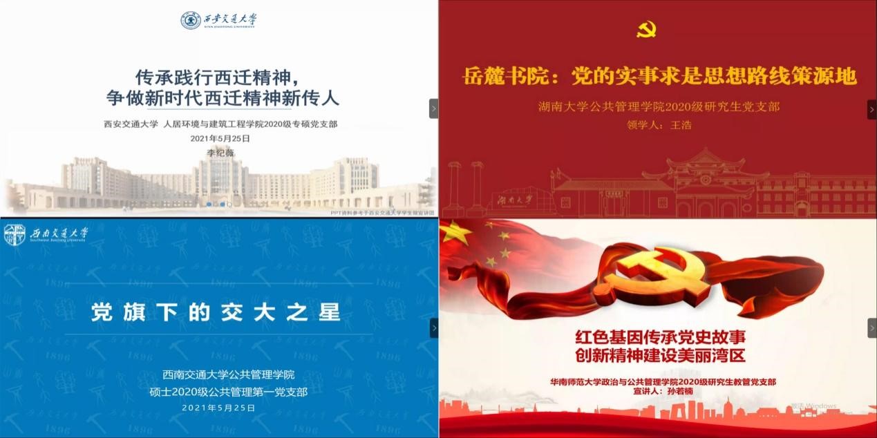 随后,yl23455永利官网硕士2020级公共管理第一党支部李一菲、湖南大学yl23455永利官网2020级研究生党支部王浩、西安交通大学人居学院2020级专硕党支部李纪薇、华南师范大学政治与yl23455永利官网2020级研究生教管党支部孙若楠分别进行了题为《党旗下的交大之星》《岳麓书院:党的实事求是思想路线策源地》《传承践行西迁精神,争做新时代西迁精神新传人》《红色基因传承党史故事,创新精神建设美丽湾区》的主题宣讲,将党史学习教育宣讲与各校校史校情、杰出校友、区域情况和学校精神策源互相结合贯通,让党史学习教育在青年党员中生动鲜活起来,真正发挥高校党史学习教育的鲜明特色和优势。