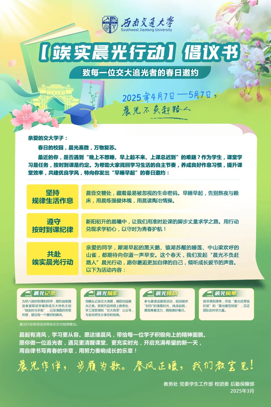 亲爱的同学,犀湖早起的黑天鹅、镜湖苏醒的睡莲、中山梁欢呼的山雀,都期待向你道一声早安。这个春天,2025年4月7日—5月7日,我们发起“晨光不负赶路人”晨光行动,愿你邂逅更加自律的自己,倾听成长拔节的声音。以下为活动内容:
